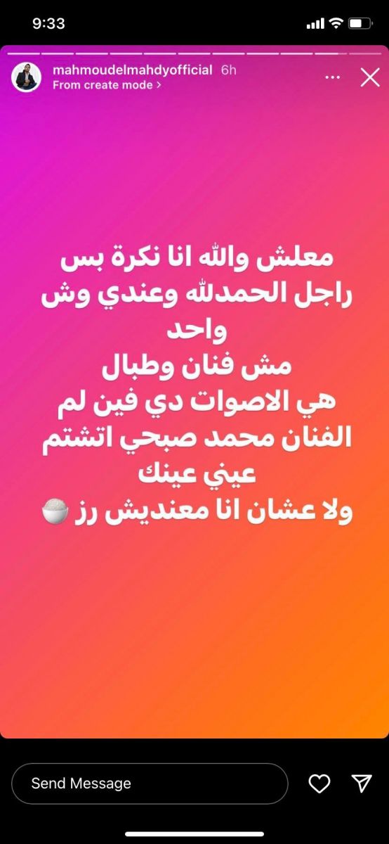 وسرعان ما رد عليه "المهدي" قائلاً: "أنا نكرة بس راجل والحمد لله عندي وش واحد مش فنان وطبال"، متابعاً: "هي الأصوات دى كانت فين لما اتشتم الفنان محمد صبحي عيني عينك ولا أنا علشان معنديش رز .. بكره هكشفلكم كم حاجة بتحصل في الوسط الجميل ده".