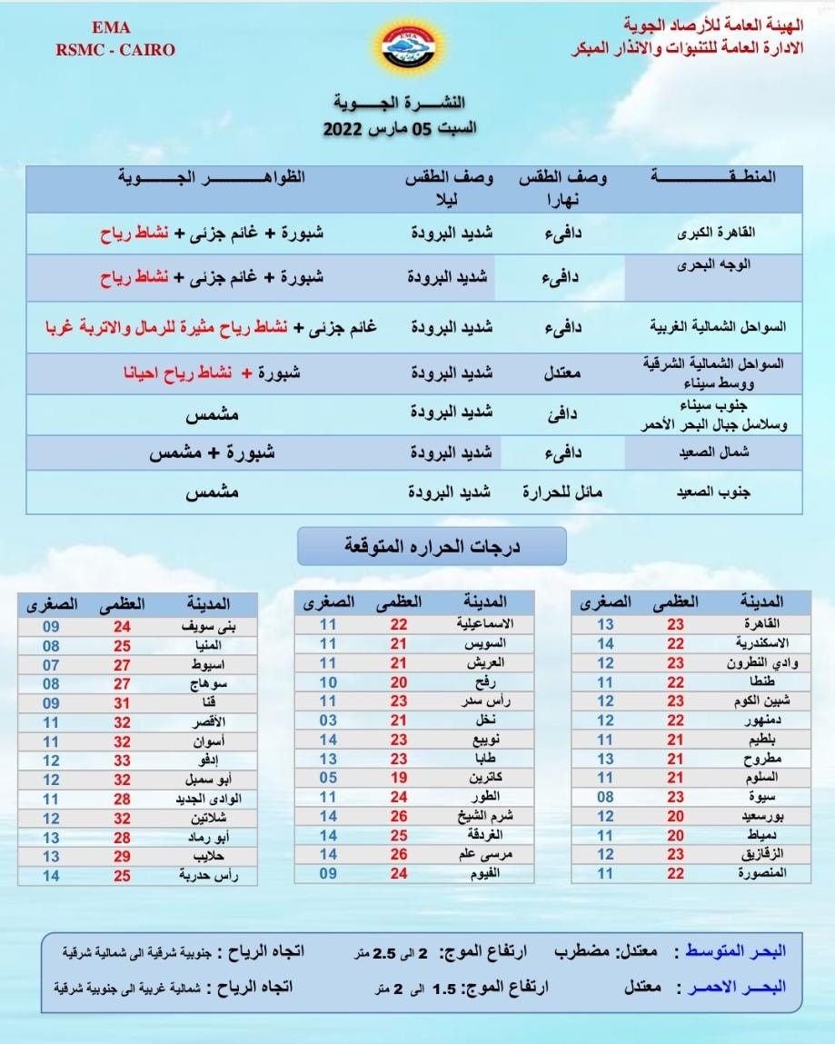 قالت الهيئة العامة للأرصاد الجوية، إن البلاد تشهد غدًا السبت طقسًا دافئًا نهارًا على القاهرة الكبرى والوجه البحري والسواحل الشمالية الغربية وجنوب سيناء وسلاسل جبال البحر الأحمر وشمال الصعيد، وطقسًا معتدلًا على السواحل الشمالية الشرقية ووسط سيناء، وطقسًا مائلًا للحرارة على جنوب الصعيد.