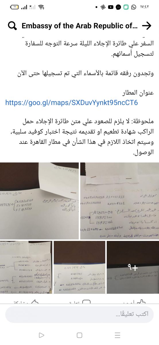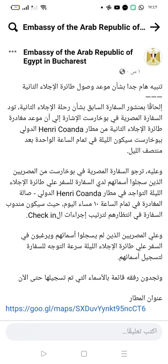 ويتطلب من المواطنين المصريين المتواجدين في رومانيا، والراغبين في العودة إلي أرض الوطن علي متن طائرة الإجلاء القادمة، تحديد مندوبين عن كل مجموعة منهم، بحيث تقوم كل مجموعة بتسليم جوازات سفرها للمندوب عنها، والذي سيتوجه بدوره نيابة عنهم للسفارة