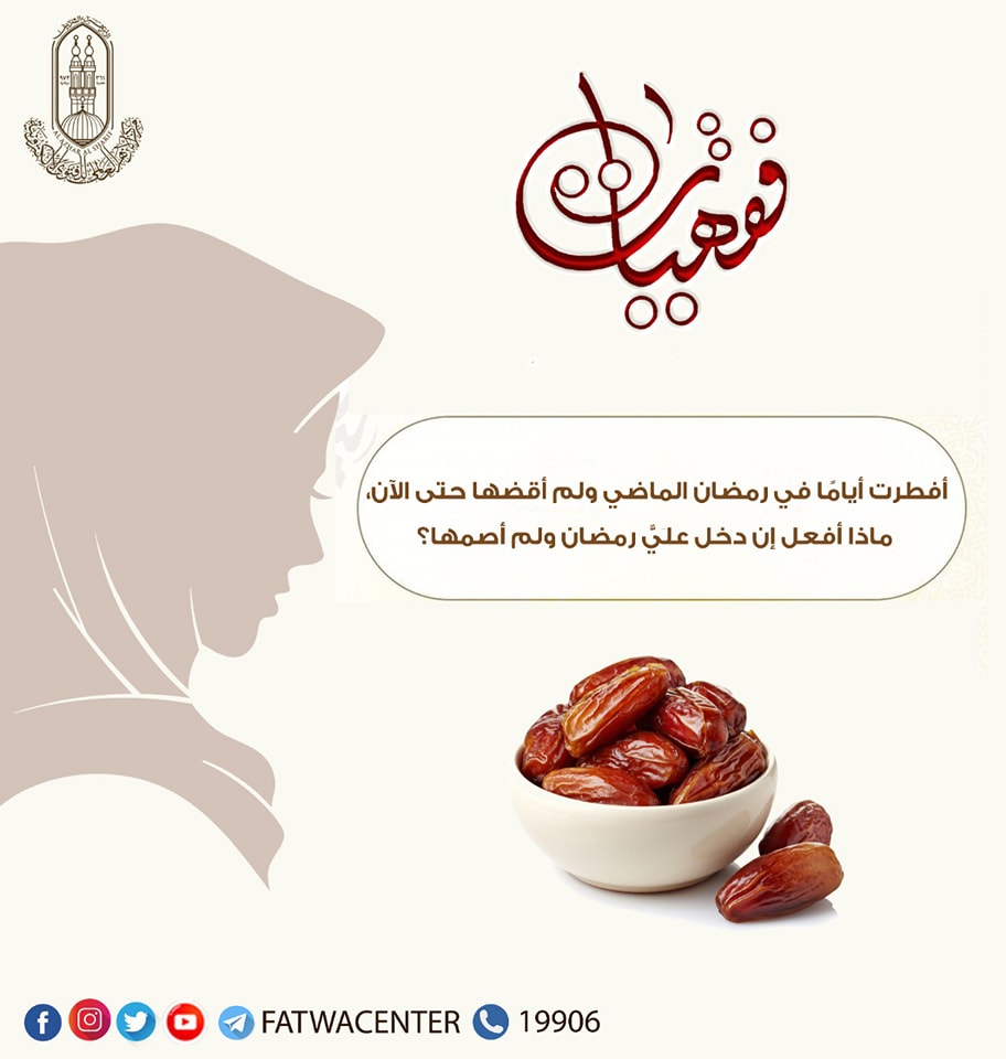 وتابع: أما إذا أخرت القضاء بغير عذر حتى دخل عليها رمضان آخر فعليها القضاء اتفاقًا، واختلف الفقهاء، هل عليها مع القضاء عن كل يوم إطعام مسكين، أم لا؟! والواجب عليها هو القضاء فقط على المفتى به.