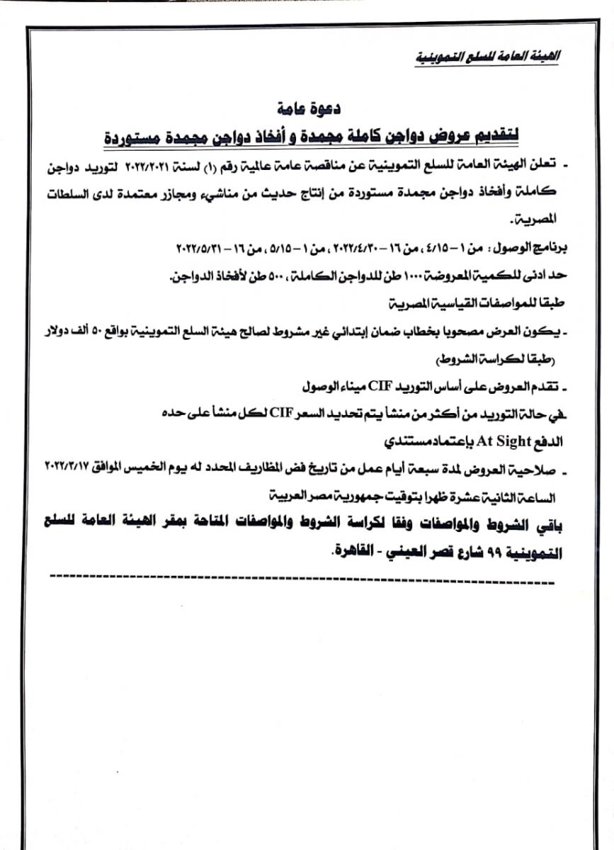 أعلنت هيئة السلع التموينية التابعة لوزارة التموين والتجارة الداخلية عن مناقصة عامة عالمية رقم (1) لسنة 2022/2021 لتوريد دواجن كاملة واتخاذ دجاج مجمدة مستوردة من إنتاج حديث من مناشيء ومجازر معتمدة لدى السلطات المصرية.