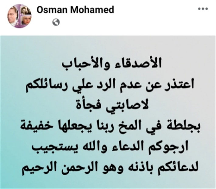 كشف الفنان الكبير عثمان محمد علي عن إصابته بجلطة في المخ، وذلك عبر صفحته الشخصية على موقع التواصل الاجتماعي الشهير "فيسبوك".