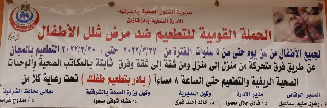وكان محافظ الشرقية قد أصدر تعليماته لرؤساء المراكز والمدن والأحياء بالتنسيق مع مديرية الصحة بالمحافظة لمد يد العون وتيسير الإجراءات ومرافقة الحملة بالقرى والتوابع والعزب للوصول إلى كل مكان داخل محافظة الشرقية لضمان نجاح تنفيذ الحملة القومية للتطعيم ضد مرض شلل الأطفال ولتحقيق المستهدف منها.
