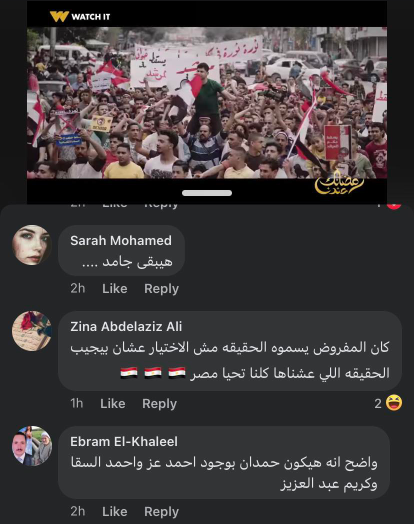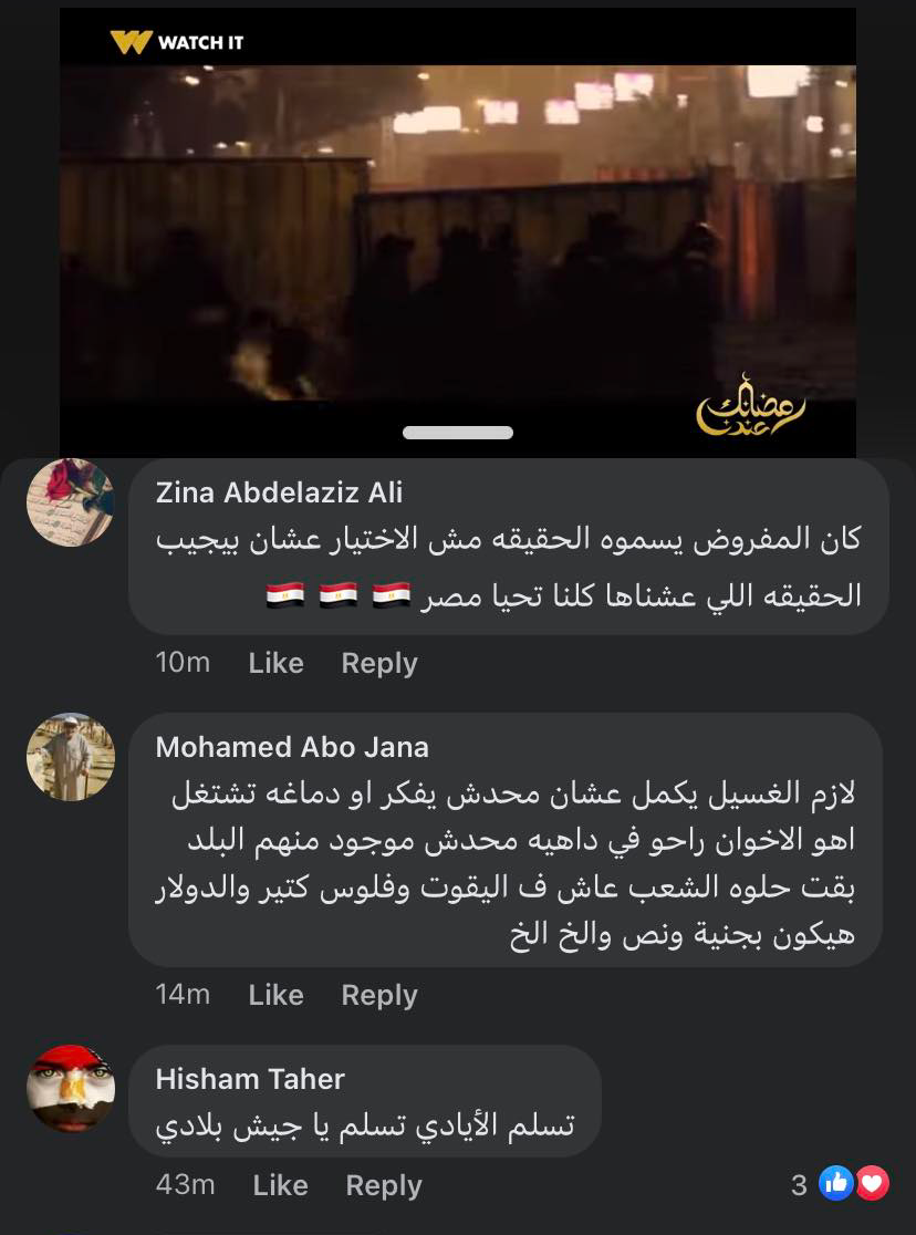 وتضمنت تعليقات الجمهور: "اخيراً .. تحيا مصر .. احنا داخلين على عظمة .. كان المفروض يسموه الحقيقة مش الاختيار عشان بيجيب الحقيقة اللي عشناها كلها .. مسلسل