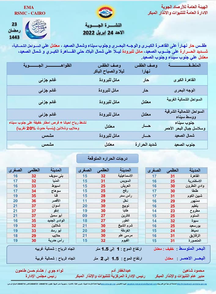 قالت الهيئة العامة للأرصاد الجوية، إن البلاد تشهد غدًا الأحد، الموافق اليوم الثالث والعشرون من شهر رمضان المبارك، طقس حار نهارًا على القاهرة الكبرى والوجه البحري وجنوب سيناء وشمال الصعيد، ومعتدل على السواحل الشمالية، وشديد الحرارة على جنوب الصعيد.