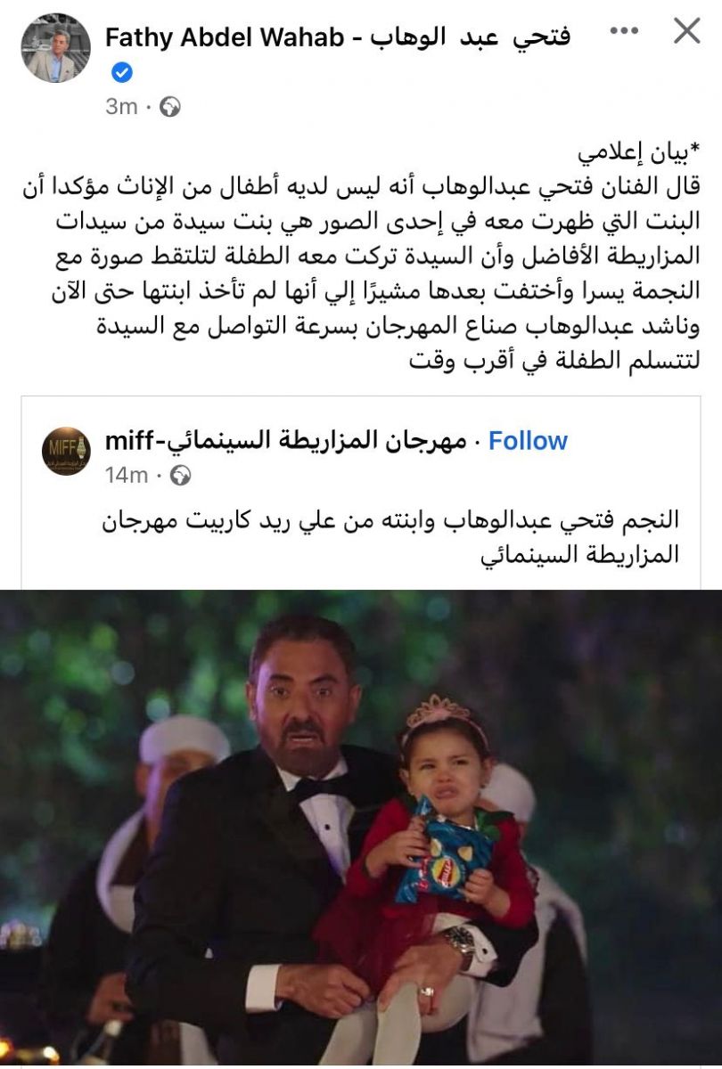 لتلتقط صورة مع النجمة يسرا واختفت بعدها، مشيرًا إلى أنها لم تأخذ ابنتها حتى الآن، وناشد عبد الوهاب صناع المهرجان بسرعة التواصل مع السيدة لتتسلم الطفلة في أقرب وقت.