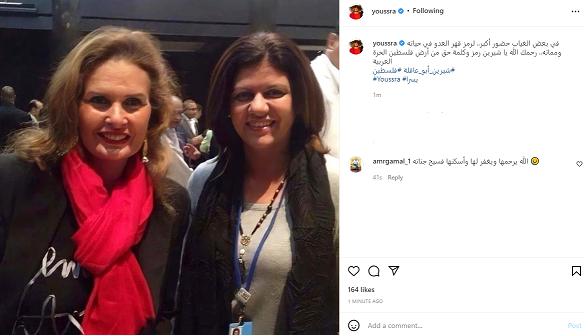 شاركت الفنانة يسرا متابعيها صورة تجمعها بالصحفية الفلسطينية الراحلة شيرين أبو عاقلة، عبر حسابها الرسمي على موقع تبادل الصور والفيديوهات الشهير "إنستجرام".