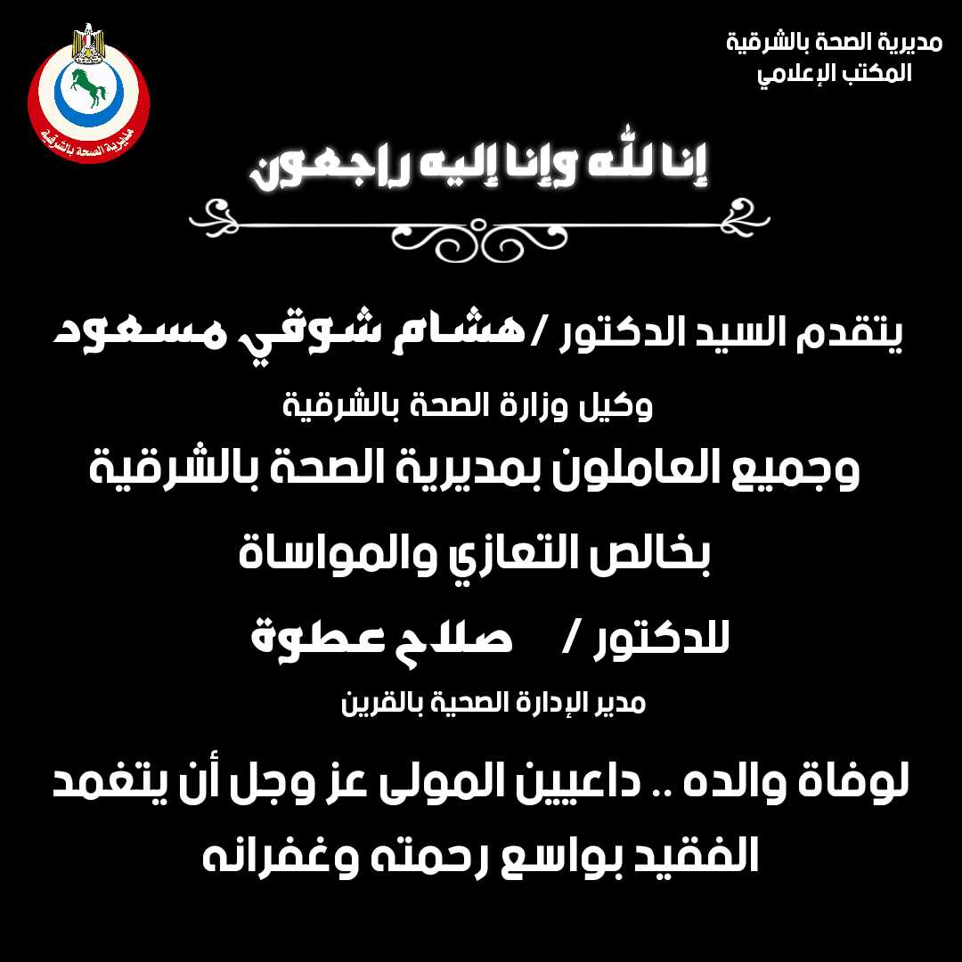 قدم الدكتور "هشام شوقي مسعود" وكيل وزارة الصحة بالشرقية ، واجب العزاء والمواساة للدكتور "صلاح عطوة" مدير إدارة القرين الصحية ، في وفاة المغفور له بإذن الله والده.