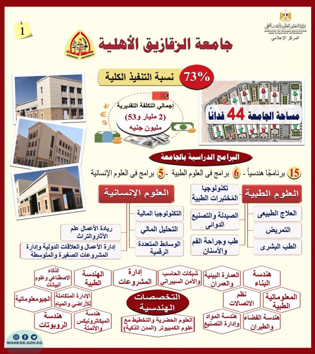 وصرح د. عادل عبدالغفار المُستشار الإعلامي والمُتحدث الرسمي أن جامعة الزقازيق الأهلية تقع على مساحة 44 فدانًا، و تشهد تقدم كبير في معدلات التنفيذ للإنشاءات الجارية بكافة مباني الجامعة والتي بلغت 73%، وبتكلفة بلغت قيمتها 2 مليار و53 مليون جنيه، كما تم الانتهاء من أعمال المباني الرئيسية،