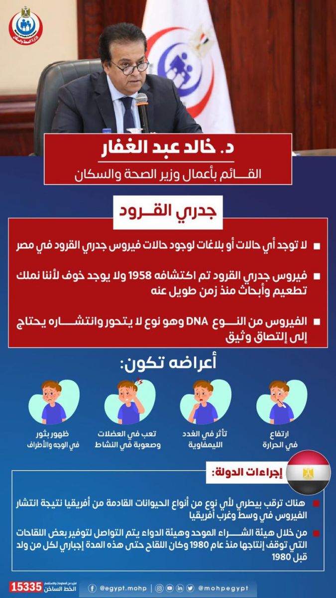 - أفاد الوزير أن فيروس جدري القردة تم اكتشافه في عام 1958، ولا يوجد خوف منه لأننا نملك تطعيما وأبحاثا منذ زمن طويل عنه.