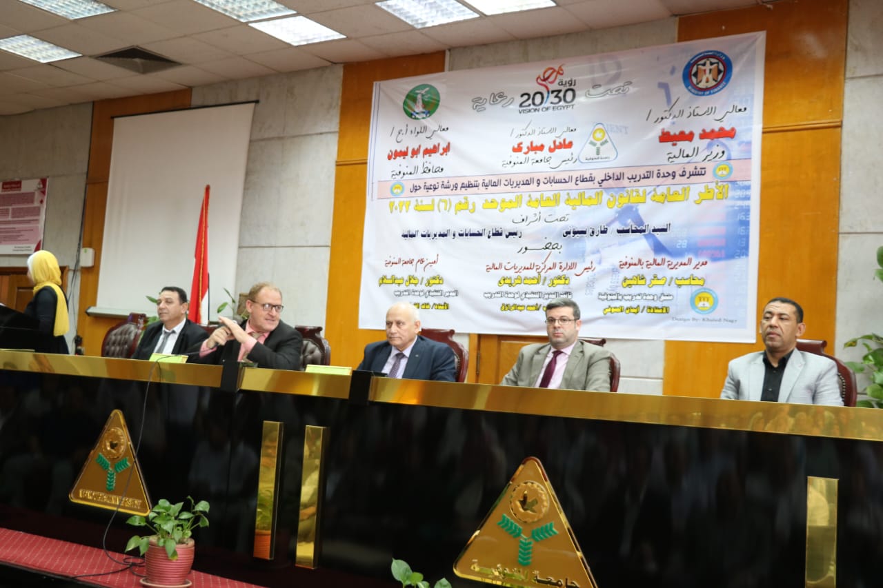 إستضافت جامعة المنوفية اليوم فعاليات ورشة العمل الموسعة حول الأطر العامة لقانون المالية العامة الموحد رقم 6 لسنة 2022 والتي نظمتها وحدة التدريب الداخلي بقطاع الحسابات والمديريات المالية وذلك تحت رعاية وزير المالية محمد معيط واللواء إبراهيم أبو ليمون محافظ المنوفية والدكتور عادل مبارك رئيس الجامعة وإشراف المحاسب طارق بسيوني رئيس قطاع الحسابات والمديريات.