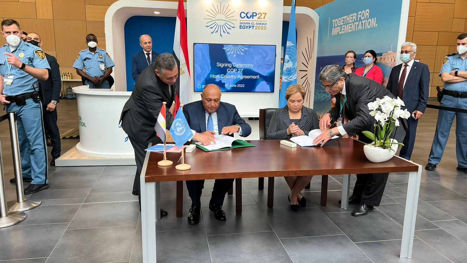 وقع وزير الخارجية سامح شكري الرئيس المعين للدورة ٢٧ لمؤتمر أطراف اتفاقية الأمم المتحدة الإطارية لتغير المناخ، و"باتريشيا اسبينوزا" السكرتيرة التنفيذية لاتفاقية الأمم المتحدة الإطارية لتغير المناخ، على اتفاقية استضافة مصر للدورة ٢٧ لمؤتمر الأطراف التي تعقد بمدينة شرم الشيخ خلال الفترة من ٦ إلى ١٨ نوفمبر ٢٠٢٢.