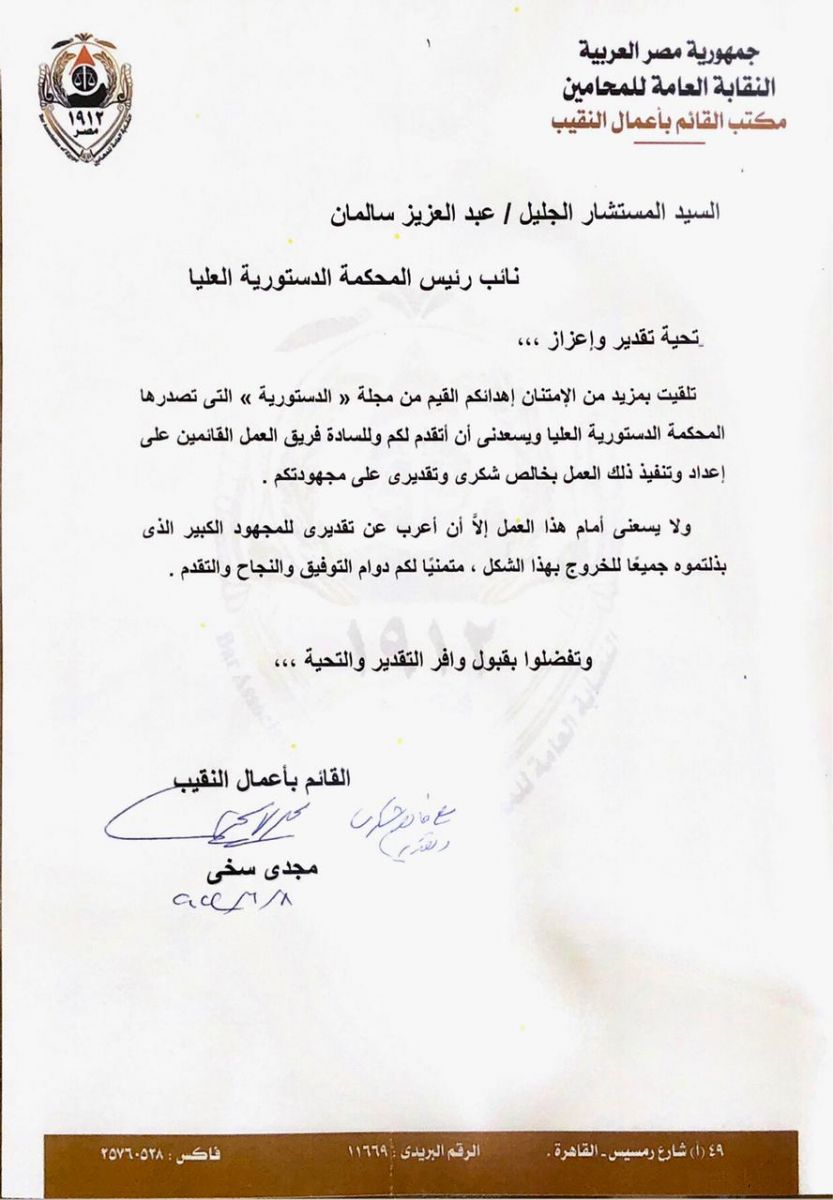 وأرسل القائم بأعمال نقيب المحامين خطاب شكر لنائب رئيس المحكمة الدستورية العليا، جاء نصه كالتالي: