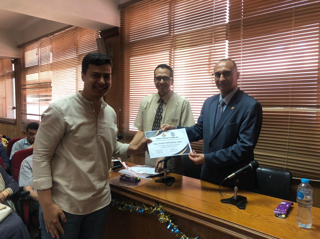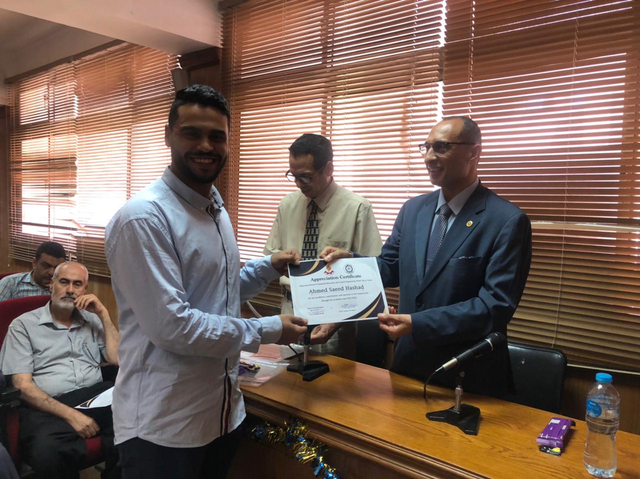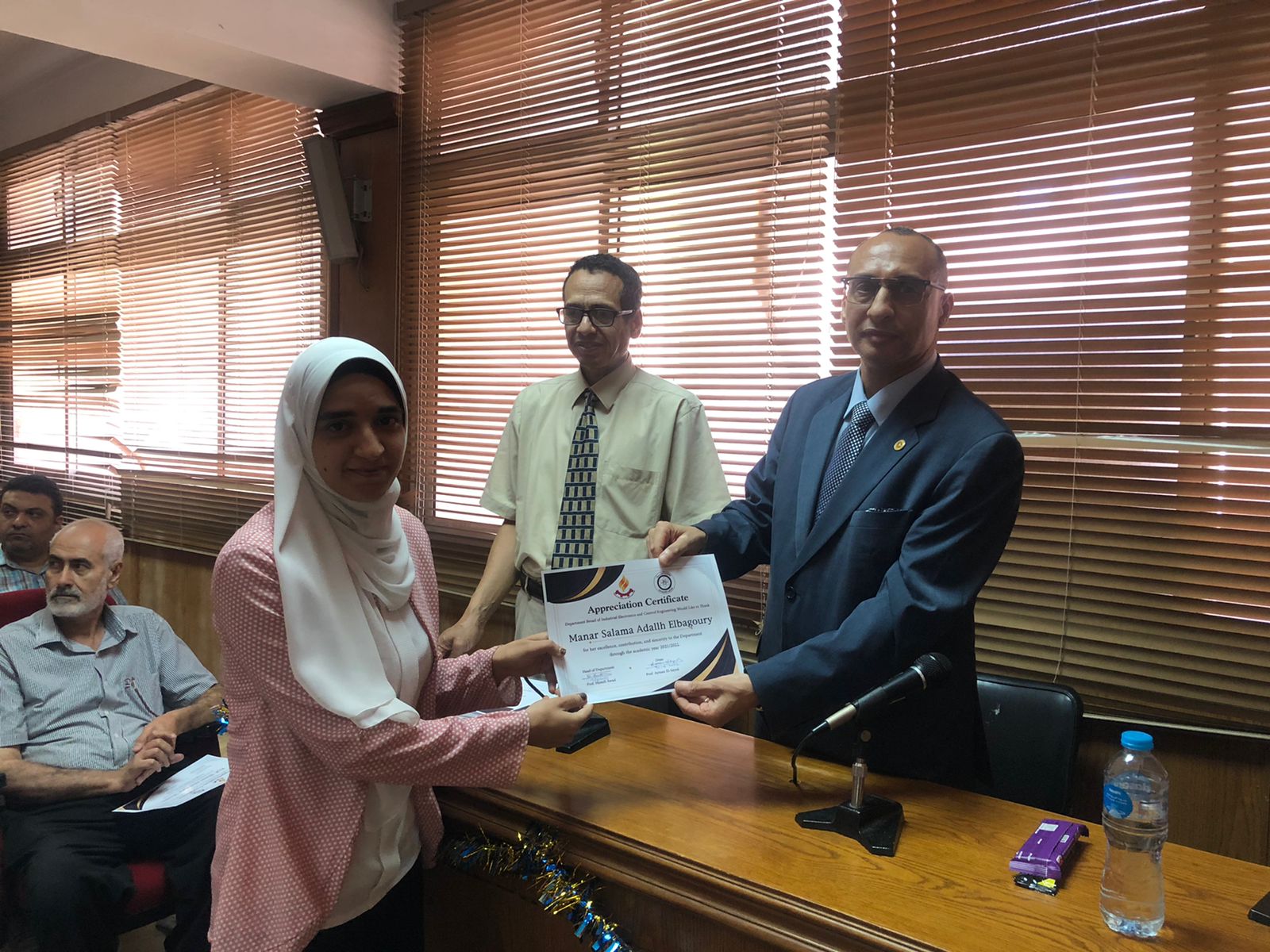 وفى نهاية المؤتمر قام الدكتور أيمن السيد عميرة والدكتور حمدى عوض بتكريم بعض من الأساتذة وأعضاء هيئة التدريس والهيئة المعاونة وبعض الطلاب المتميزين بالبرنامج والخرجين وأوائل القسم.