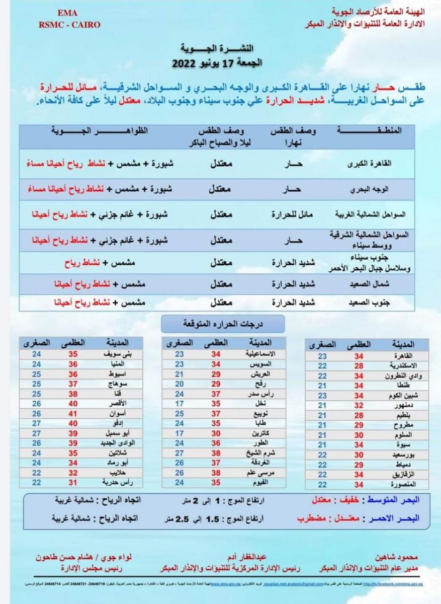 قالت الهيئة العامة للأرصاد الجوية إن البلاد تشهد غدًا الجمعة، طقسًا حارًا نهارًا على القاهرة الكبرى والوجه البحري والسواحل الشرقية، ومائلًا للحرارة على السواحل الغربية ، وشديد الحرارة على جنوب سيناء وجنوب البلاد، ومعتدلًا ليلًا على كافة الأنحاء.