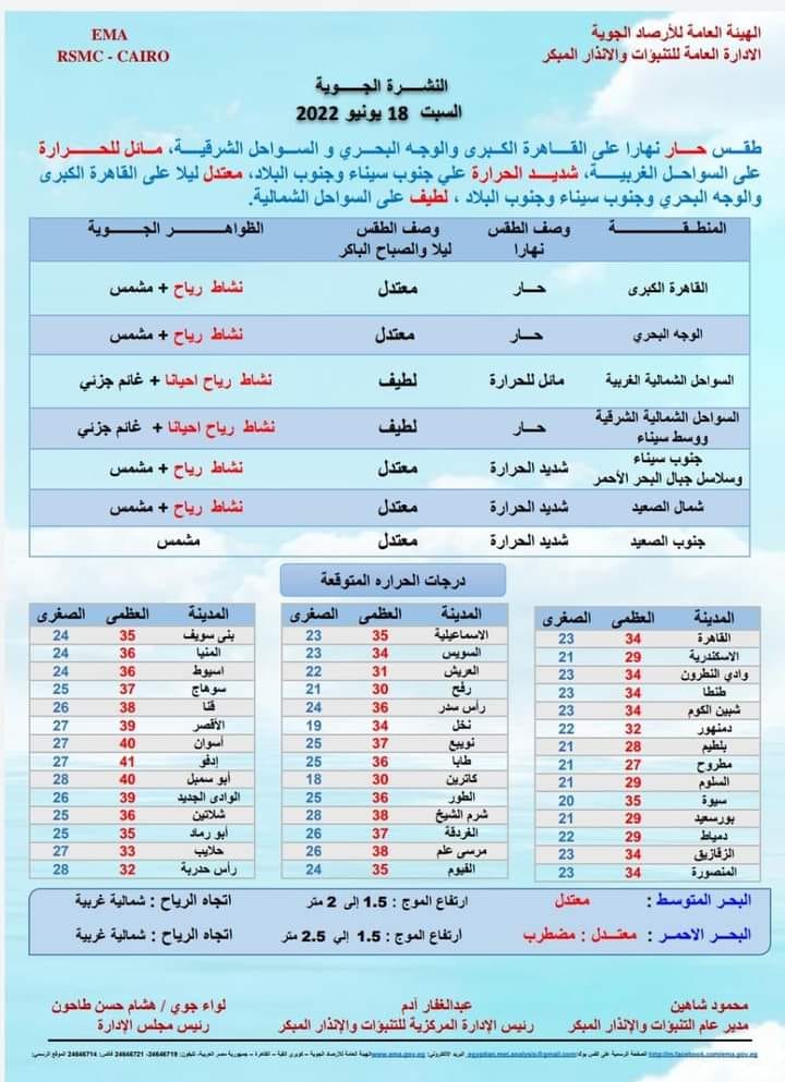 والأحد 19 يونيو ، تشهد البلاد ، نشالطا رياح احيانا ، على مناطق من القاهرة الكبرى ، والوجه البحري ، والسواحل الشرقية ، وجنوب سيناء ، وشمال الصعيد ، ومن الأثنين 20 يونيو ، وحنى الأربعاء 22 يونيو، تشهد البلاد ، نشاط رياح احيانا ، على مناطق من القاهرة الكبرى ، والوجه البحري ، والسواحل الشمالية ، وجنوب سيناء ، وجنوب البلاد، والخميس 23 يونيو ، تشهد البلاد ، نشاط رياح احيانا مساءا ، على مناطق من القاهرة الكبرى ، والوجه البحري ، والسواحل الغربية ،وجنوب سيناء .