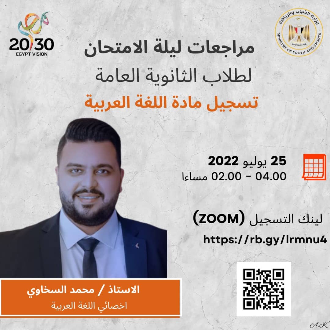 واصلت وزارة الشباب والرياضة، برئاسة الدكتور أشرف صبحي ، ثاني قنوات مراجعات ليلة الامتحان في مادة اللغة العربية ، حيث يؤدي طلاب الثانوية العامة 2022 بشعبتَيها "العلمية والأدبية" امتحان اللغة العربية، غدًا الأحد .