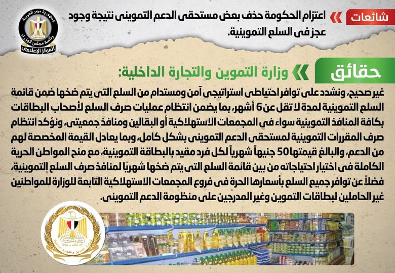 وتواصل المركز الإعلامي لمجلس الوزراء مع وزارة التموين والتجارة الداخلية، التي نفت تلك الأنباء، مُؤكدةً أنه لا صحة لحذف بعض مستحقي الدعم التمويني، أو وجود عجز في السلع التموينية.