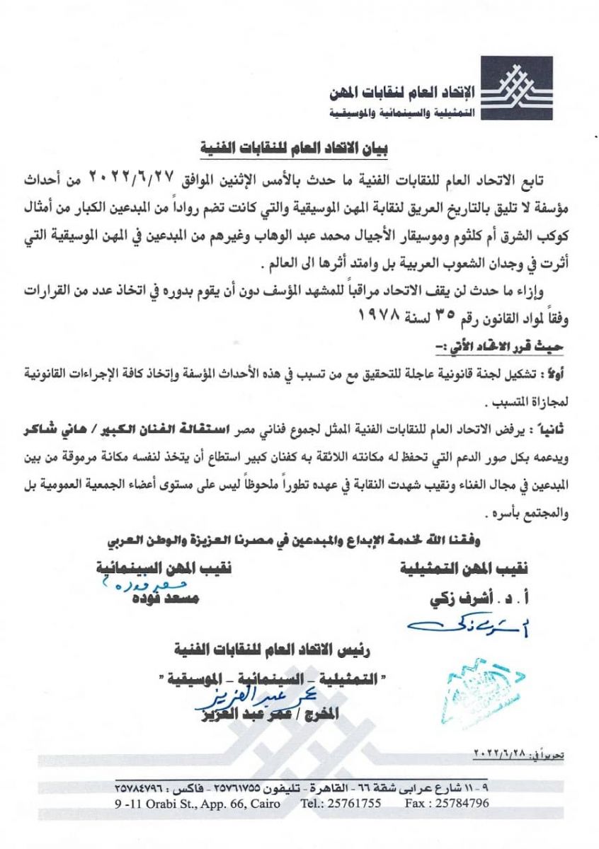 وجاء البيان كالآتي: تابع الاتحاد العام للنقابات الفنية ما حدث أمس من أحداث مؤسفة لا تليق بالتاريخ العريق لنقابة المهن الموسيقية، والتي ضمت روادًا من المبدعين الكبار من أمثال كوكب الشرق أم كلثوم وموسيقار الأجيال محمد عبدالوهاب وغيرهم من المبدعين فى المهن الموسيقية التي أثرت فى وجدان الشعوب العربية بل وامتد أثرها إلى العالم.