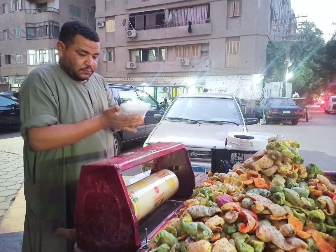 على عربة خشبية يعلوها صفوف من "فاكهة الغلابة" ذات اللون الأخضر والمكسوة بالأشواك، يقف "أيمن علي"، بائع التين الشوكي، بأحد الشوارع الجانبية المتفرعة من شارع الهرم بمحافظة الجيزة، حيث أصبح ذلك الرجل ذو البشرة السمراء والجلباب الصعيدي من أهل المنطقة والبائع الرسمي للفاكهة الموسمية الأشهر.
