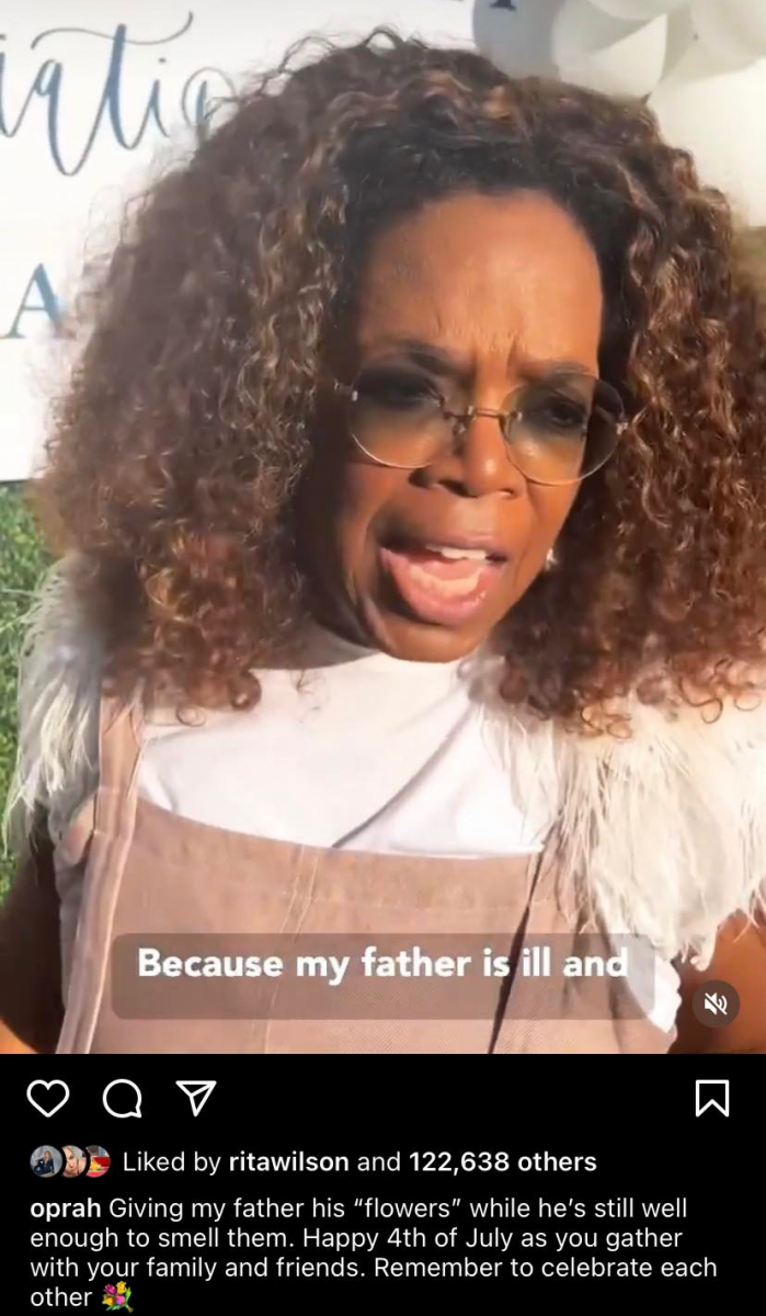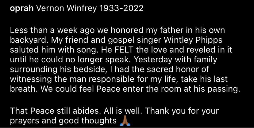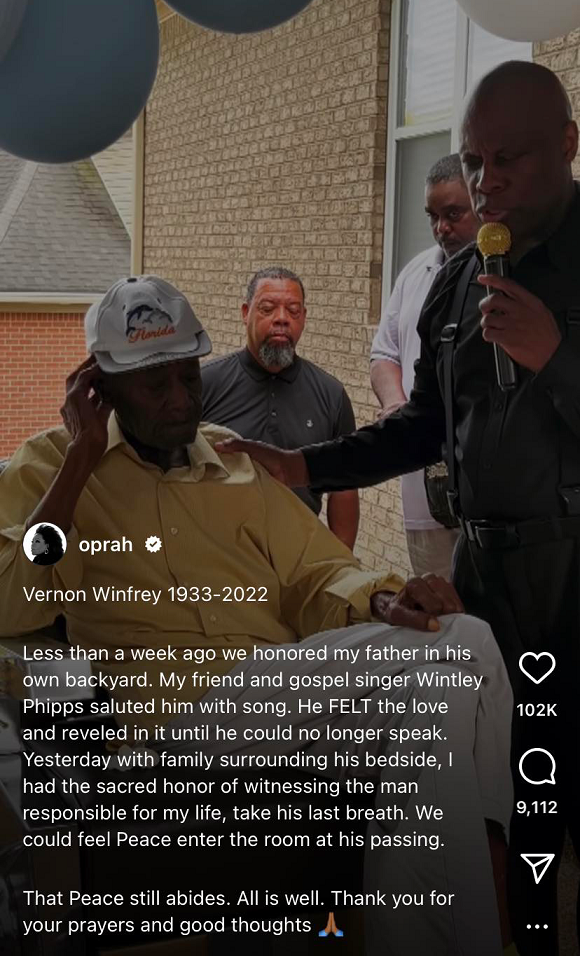 نشرت "وينفري" مقطع فيديو لوالدها قبل وفاته وأرفقته بتعليق تقشعر له الأبدان حيث قالت: "بعد مرور أقل من أسبوع على احتفائي مع العائلة بوالدي من خلال مقطوعة غنائية بصوت صديقي المطرب وينتلي فيبس، بالأمس ونحن نجلس حوله، كان لي عظيم الشرف أن أكون بجانب الرجل المسؤول عن حياتي وهو يلفظ أنفاسه الأخيرة على فراش الموت".
