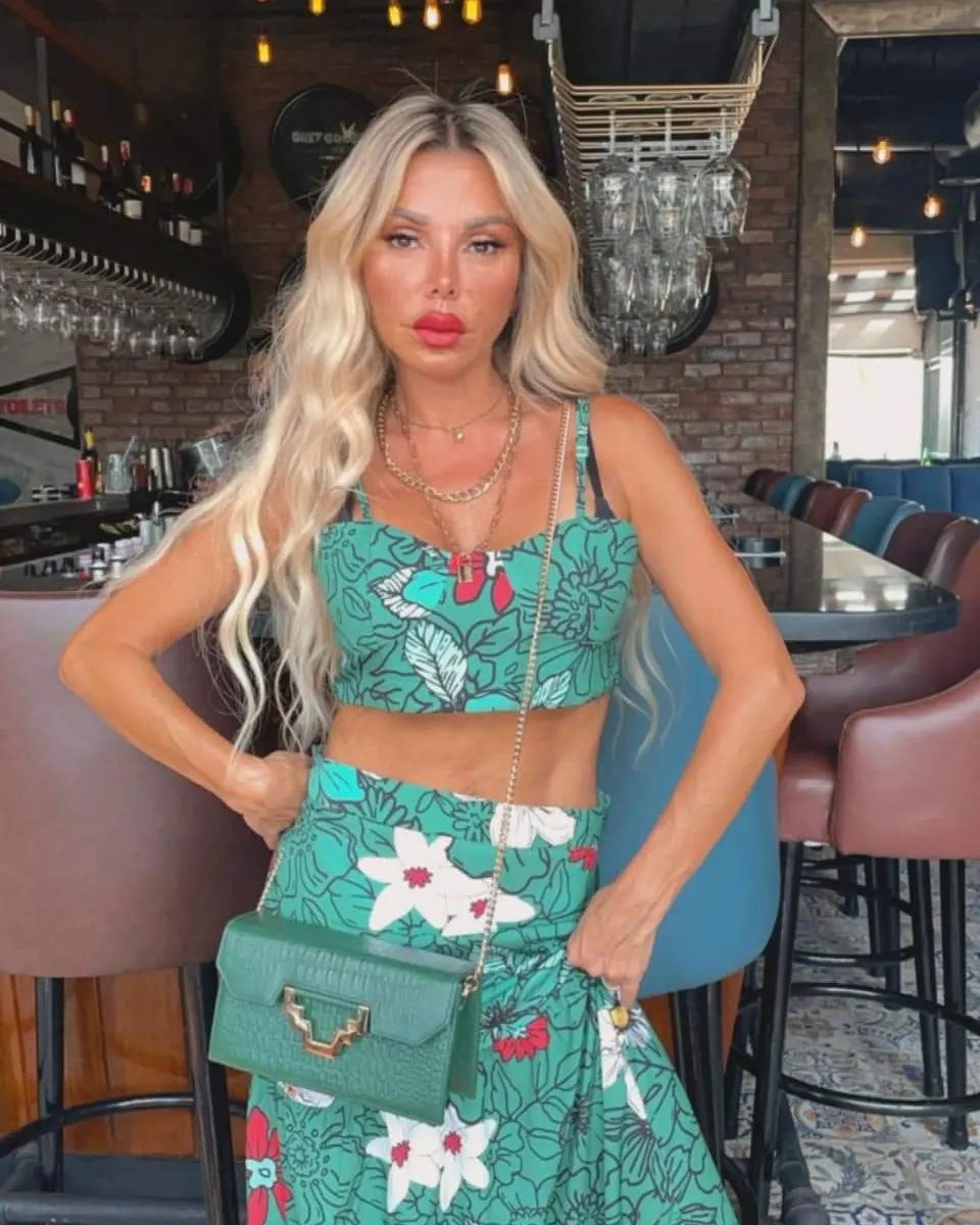 وبدت رزان بإطلالة مميزة، حيث ارتدت تنورة مُجسمة ومنقوشة باللون الأخضر والأبيض والفوشيا، ونسقت معها كروب توب مكشوف البطن نفس اللون، مما أبرز نحافة خصرها وقوامها الممشوق.