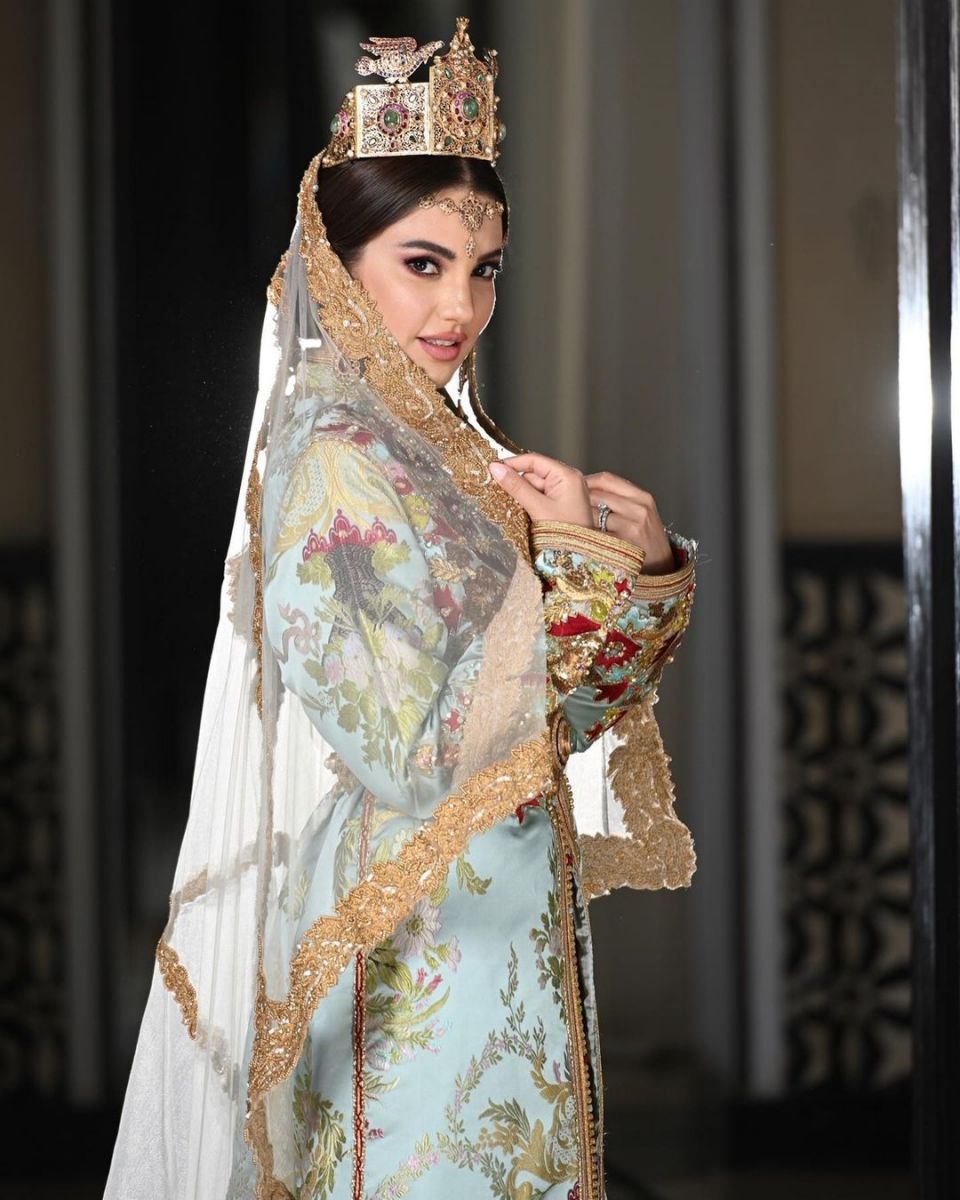 وبدت درة بالقفطان المغربي باللون الأزرق السماوي الفاتح، والطبقة السفلي باللون الأحمر، وتميز بتطريزاته العربية الراقية باللون الأحمر والذهبي والأخضر، وحددت خصرها بحزام ذهبي مرصع بالأحجار الكريمة، مما أبرز رقيها وقوامها الممشوق.