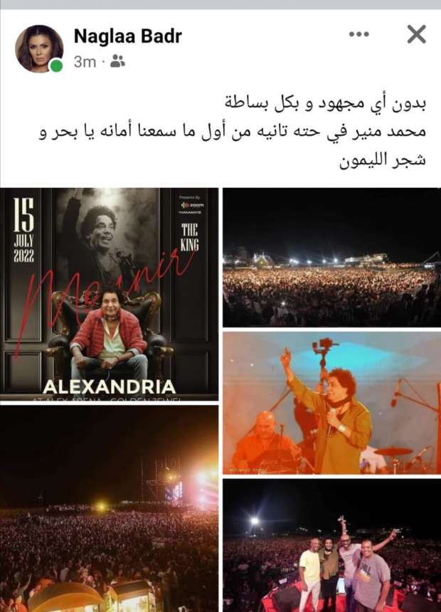 نشرت الفنانة نجلاء بدر عددًا من الصور من حفل الكينج محمد منير فى الإسكندرية، وذلك عبر صفحتها الرسمية على موقع التواصل الاجتماعى فيسبوك .