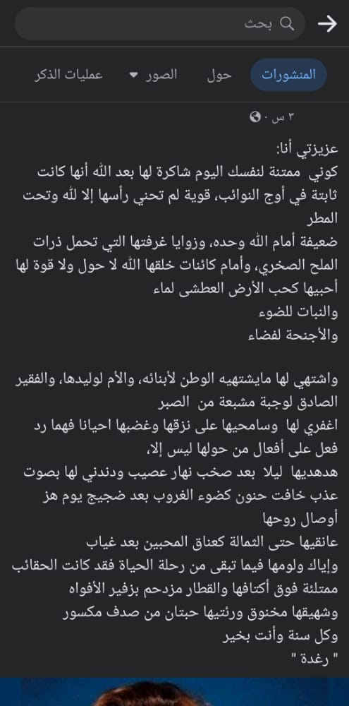 وكتبت رغدة :" عزيزتي أنا .. كوني  ممتنة لنفسك اليوم شاكرة لها بعد الله أنها كانت ثابتة في أوج النوائب، قوية لم تحني رأسها إلا لله وتحت المطر ضعيفة أمام الله وحده، وزوايا غرفتها التي تحمل ذرات الملح الصخري، وأمام كائنات خلقها الله لا حول ولا قوة لها".
