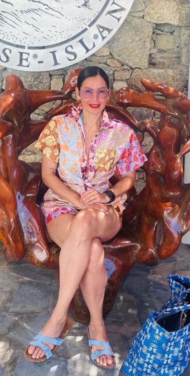 وبدت لقاء بإطلالة صيفية مبهجة، والتي تميزت بألوانها المتعددة كالأحمر والأزرق والبرتقالي والأصفر، مرتدية بدلة صيفية، عبارة عن هوت شورت وفوقه قميص بنصف أكمام ومكشوف ناحية الصدر، وقامت بربط أطرافة عند منطقة الخصر؛ لتبرز أنوثتها وقوامها الممشوق.
