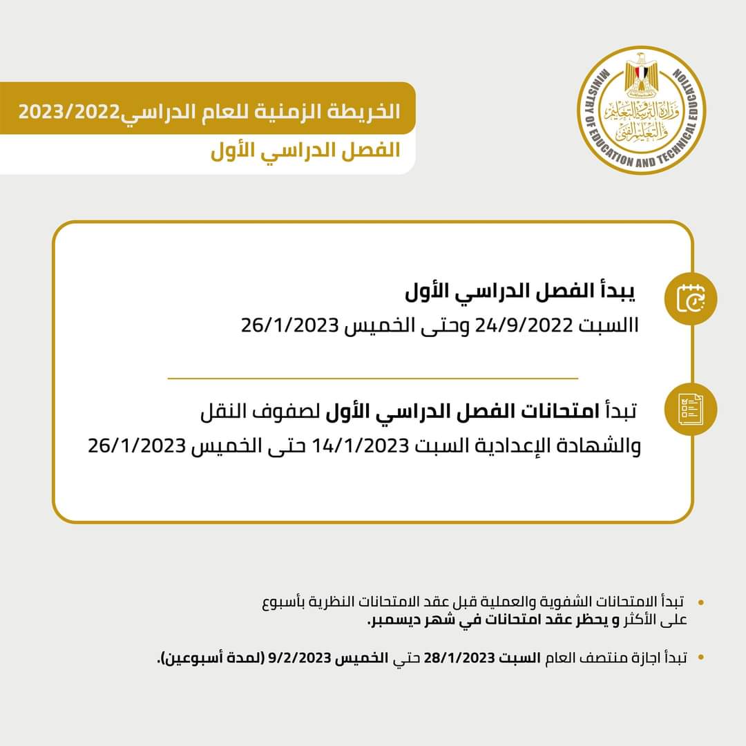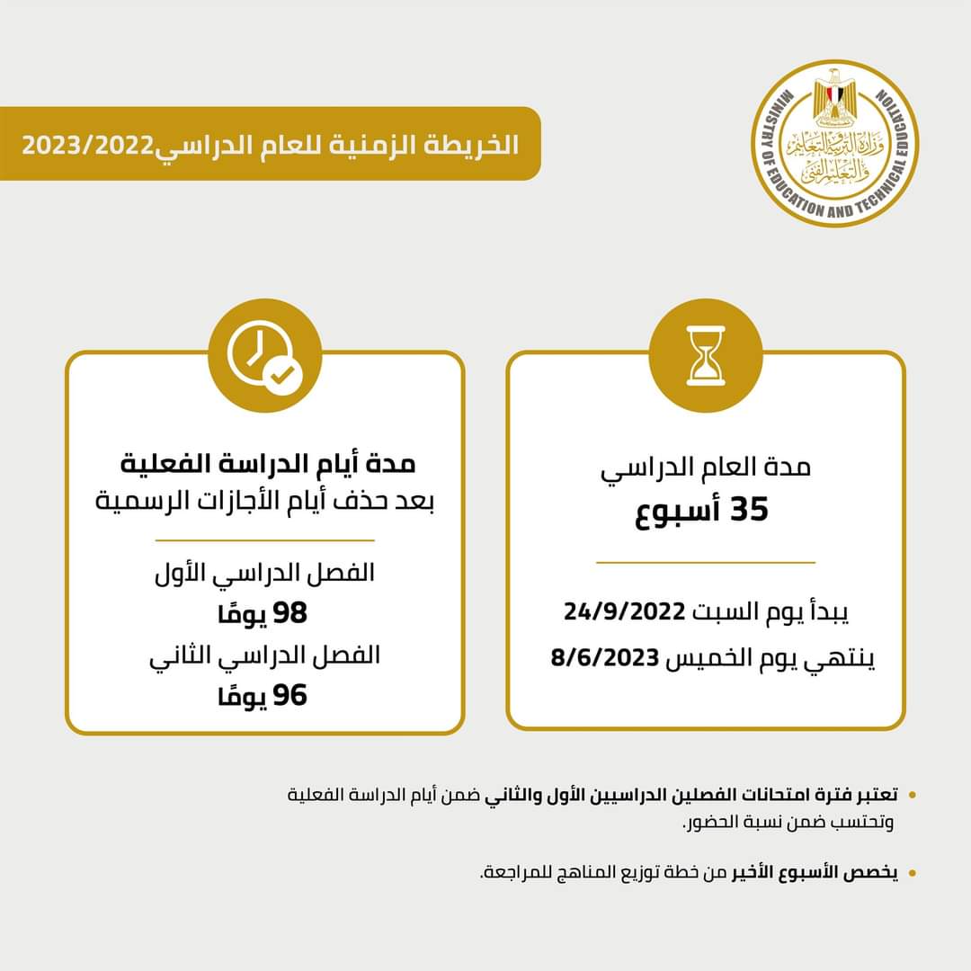 أعلنت وزارة التربية والتعليم والتعليم الفني، عن الخريطة الزمنية للعام الدراسي 2022/2023، لجميع مراحل التعليم المختلفة للمدارس الرسمية والرسمية للغات والخاصة والخاصة للغات.