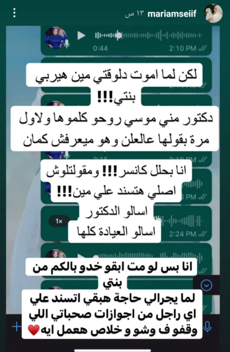 كما كشفت أنه تخلى عنها وقت مرضها إذ قالت انها ذهبت لطبيب لعمل الفحوصات الخاصة بمرض السرطان قائلة : "كنت ساكتة وحبتش أخرب بيتي.. ومن يوم ولادة بنتي أنا المتكفلة بكل مصاريف البيت.. أنا أول مرة هقولها في العلن.. أنا بحلل كانسر ومقلتلوش.. أصل هتسند على مين".