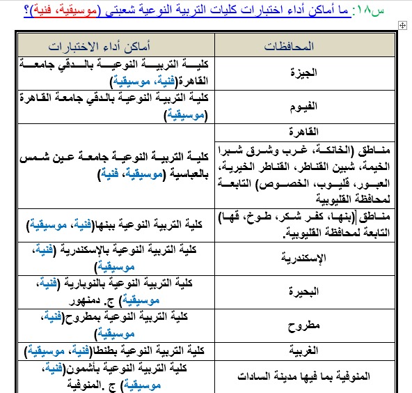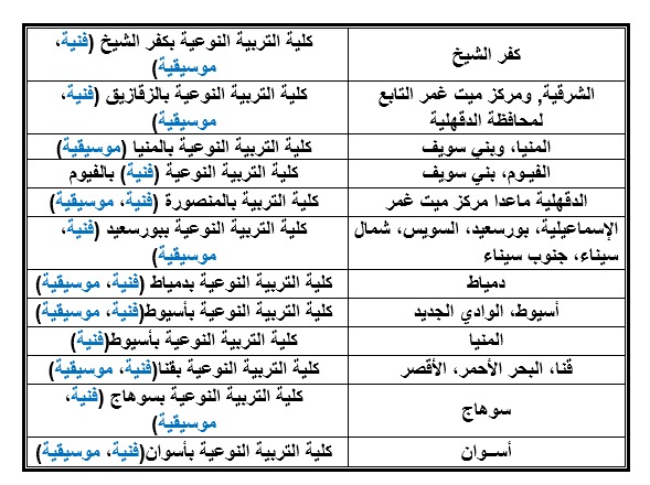 • شعبتا التربية (التربية الفنية والتربية الموسيقية) بكليات التربية النوعية وشعبة المسرح التربوي بكلية التربية النوعية جامعة المنصورة وفرعيها (ميت غمر – منية النصر).