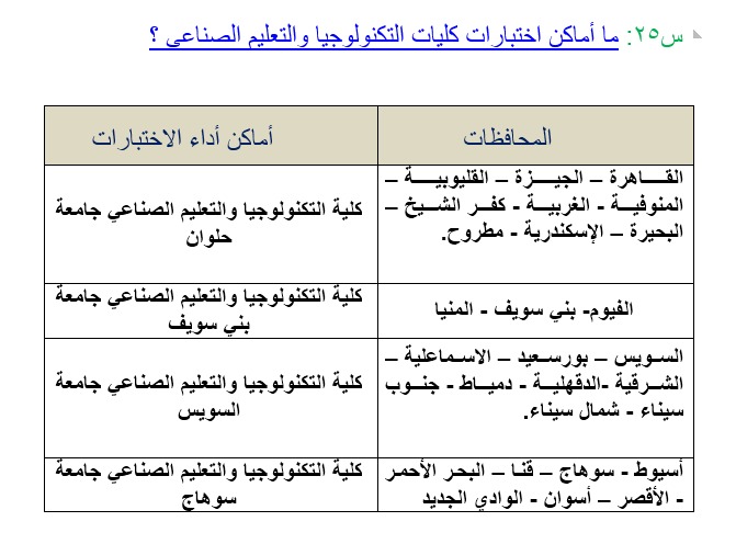 • كليات التكنولوجيا والتعليم الصناعي بجامعات (حلوان – السويس – بني سويف –سوهاج).