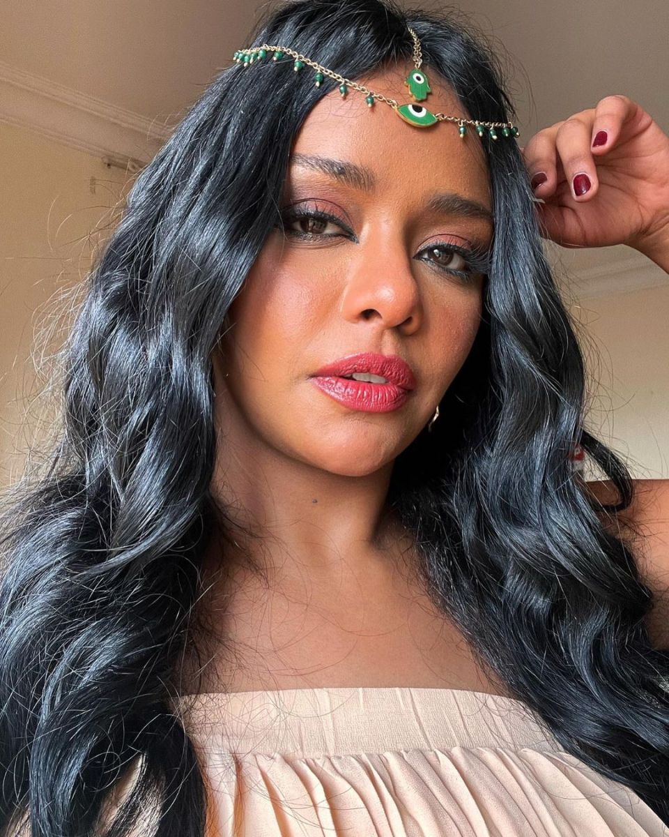 ووضعت مكياجًا ناعمًا يتماشي مع استايلها، حيث إعتمدت العيون الواسعة بإستخدام الكحل الأسود، بالإضافة لظلال العين باللون الوردي المدمج مع البني الداكن، واختارت أحمر شفاه باللون الفوشيا الفاتح.