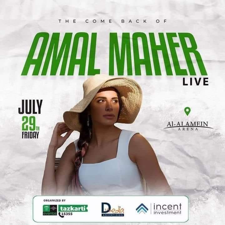 تحيي الفنانة آمال ماهر، حفلها الغنائي الصيفي بمدينة العلمين في الساحل الشمالي، بعد غياب عامين عن أنشطتها الغنائية، وذلك ضمن فعاليات الموسم الصيفي المقام هناك.