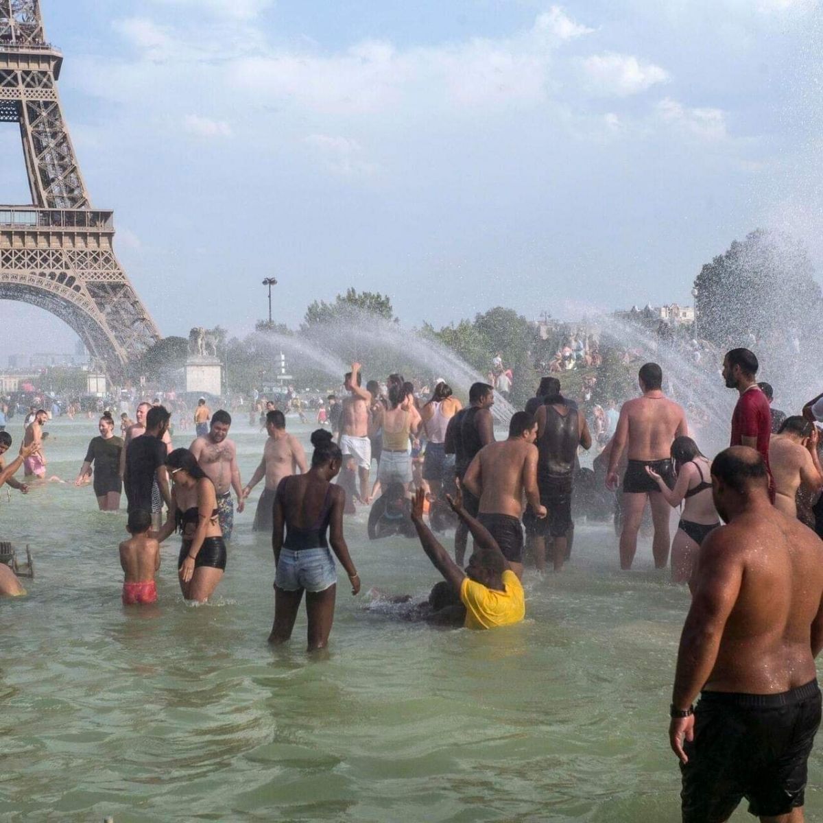 تداولت صور عبر مواقع التواصل الاجتماعي لنافورات برج إيفل وهي تتحول إلى مسبح عام بعد القيود التي فرضتها الحكومة على المواطنين، وتقليل استخدام المياه والكهرباء، قرر الشعب الفرنسي الهروب من موجة الطقس الحار إلى النافورات وتحويلها إلى مسابح عامة يسبح فيه عامة الشعب و الأطفال.