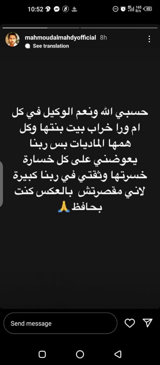 بينما نشر "المهدي" : "حسبي الله ونعم الوكيل في كل ام وراء خراب بيت بنتها وكل همها الماديات بس ربنا يعوضني عن كل خسارة خسرتها وثقتي في ربنا كبيرة لاني مقصرتش بالعكس كنت بحافظ.