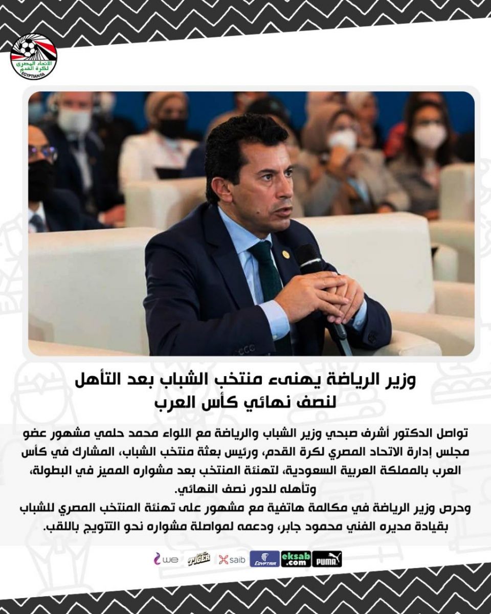 تواصل الدكتور أشرف صبحي وزير الشباب والرياضة مع اللواء محمد حلمي مشهور عضو مجلس إدارة الاتحاد المصري لكرة القدم، ورئيس بعثة منتخب الشباب، المشارك في كأس العرب بالمملكة العربية السعودية، لتهنئة المنتخب بعد مشواره المميز في البطولة، وتأهله للدور نصف النهائي.