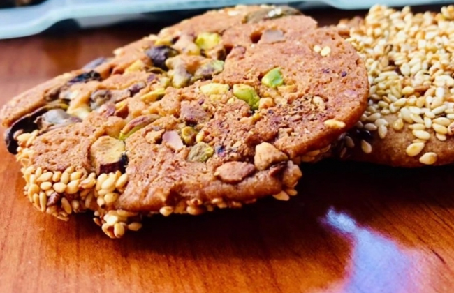 3- تشكل العجينة الى كرات صغيرة متناسقة، ثم تغمس في الفستق المجروش، ومن بعدها في السمسم المحمص، وترص في صواني مفروشة بورق الزبدة.