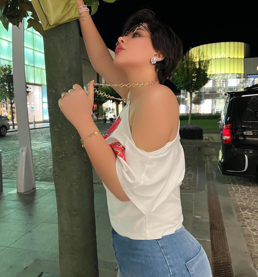 وانتعلت حذاءً ضخمًا باللون الأبيض، وتزينت بمجموعة من المجوهرات الذهبية، حيث ضمت سلسلة متوسطة الطول وأساور في اليدين بالإضافة لحلق شكل الوردة البيضاء.