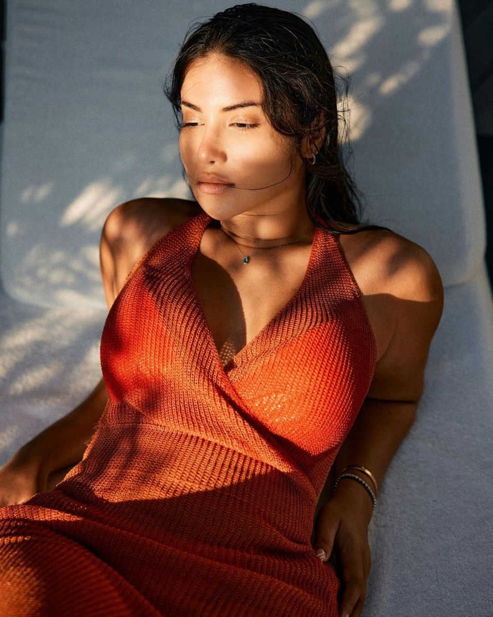 ونشرت عبر الحالة الخاصة بها صورة وهي وسط البحر مرتدية مايوه برتقالي بصيحة الكتف الواحد، ومكشوف من أحد الجانبين؛ لتظهر بشكل مثير وجذاب.