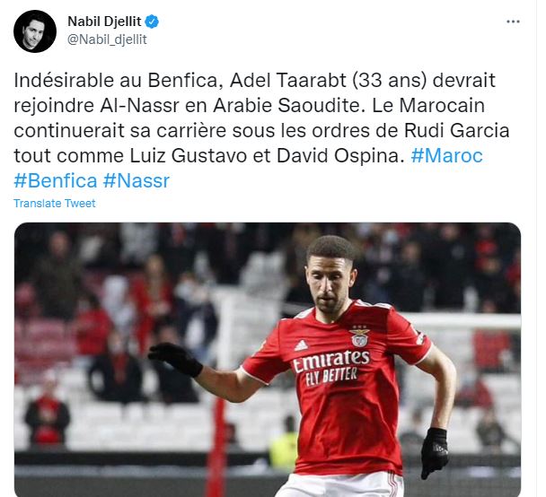 وكشفت صحيفة فرانس فوتبول" الفرنسية، أن نادي النصر اقترب من حسم التعاقد مع الدولي المغربي، عادل تاعرابت، لاعب وسط نادي بنفيكا البرتغالي خلال الميركاتو الصيفي الجاري.