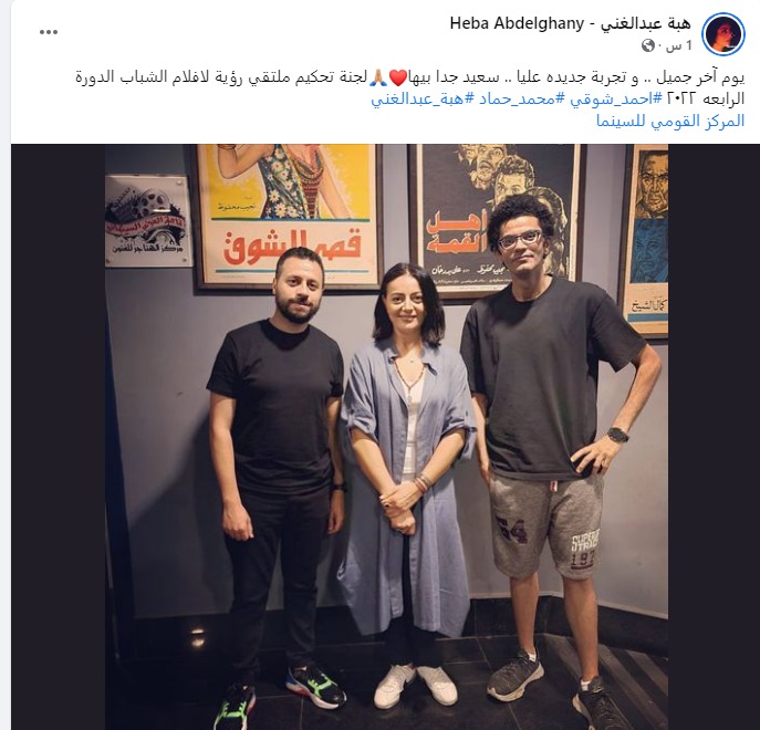ونشرت هبة عبد الغني، عبر حسابها الشخصي بموقع التواصل الاجتماعي "فيسبوك"، صورتها كلا من أحمد شوقي ومحمد حماد أعضاء، لجنة تحكيم الدورة الرابعة من ملتقى رؤية لأفلام الشباب.