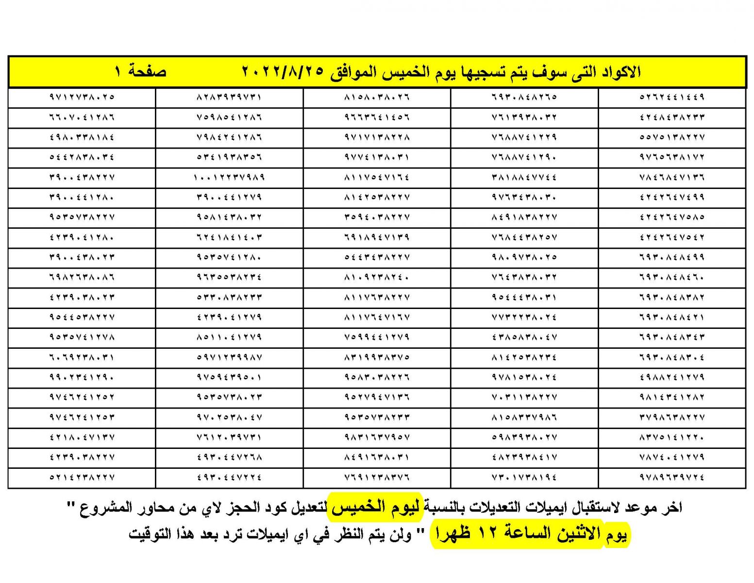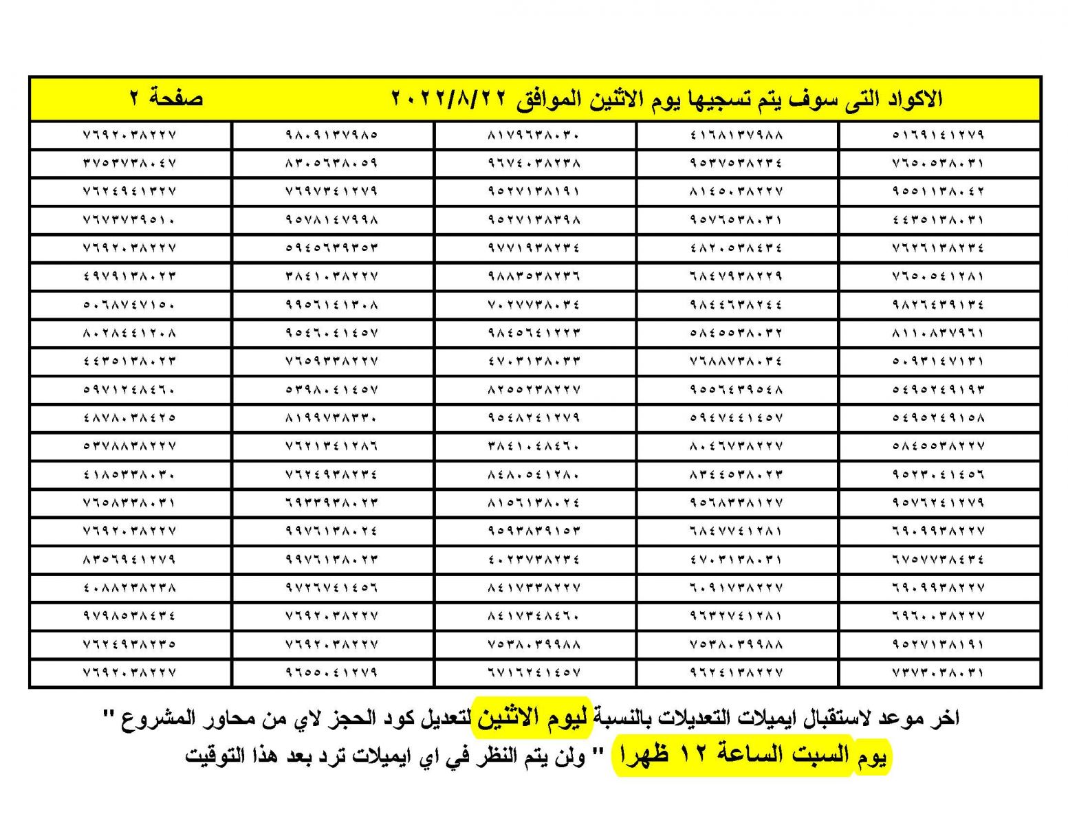 وتستعرض بوابة الوفد الإلكترونية،  بيان بالإكواد التى سيتم تسجيلها بشكل يومى للتسهيل على الحاجزين متابعة التخصيص، اعتبارًا من اليوم الإثنين، الموافق  2022/8/22 حتى الخميس المقبل الموافق 2022/8/25: