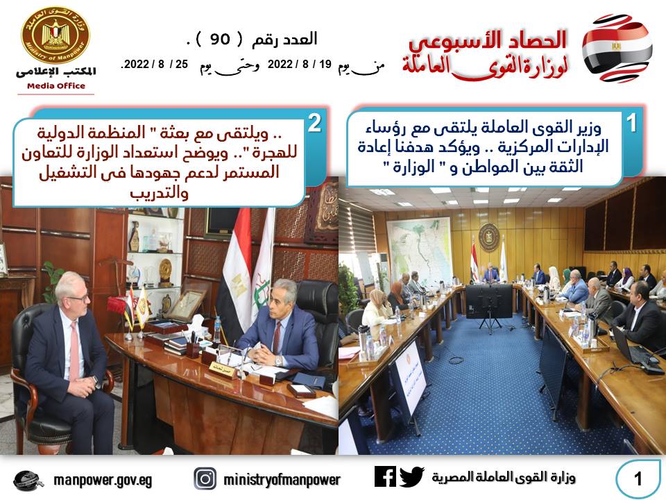 شهدت وزارة القوى العاملة خلال هذا الأسبوع في الفترة من 19 إلى  25  أغسطس  2022، مجموعة من اللقاءات والأنشطة التي كشفت عن حرص الوزير حسن شحاتة على حث كافة الإدارات  في الداخل والخارج بالعمل وفي أسرع وقت على إعادة الثقة بين المواطن والوزارة، والتعامل مع المواطنين بمصداقية وشفافية وعرض الأرقام والبيانات الحقيقية أمام الرأي العام.