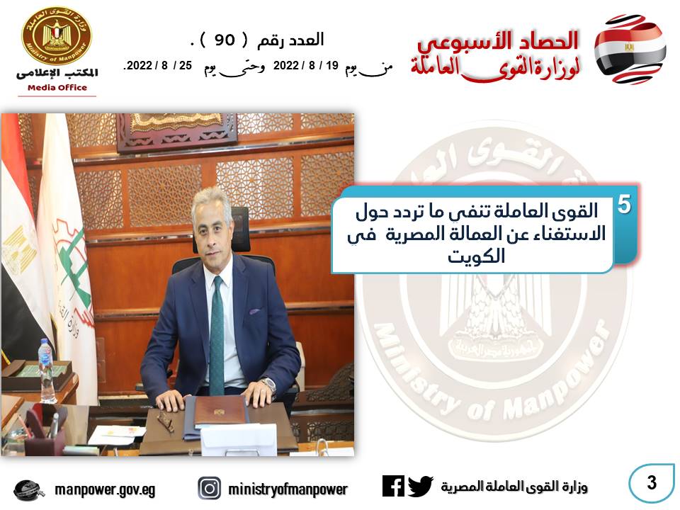 ولمواجهة حروب الجيل الرابع التي تعتمد على نشر الشائعات،واجهت وزارة القوى العاملة شائعة نشرتها بعض وسائل الإعلام ،بشأن إستغناء دولة الكويت عن ما يقرب من 2 مليون عامل مصري"!!" ،فأسرعت "الوزارة" بنفي تلك الشائعة ،ووزعت "البيان الوزاري" على مواقع مصرية وعربية وأجنبية ،حيث أكدت "الوزارة" على أنها لم تتلقى أي إختار من دولة الكويت الشقيقة –حتى الأن- بالإستغناء عن أي عامل مصري ،وأن هذا الرقم المتداول عن حجم العمالة المصرية في الكويت غير صحيح ،وأنه في حال ترك أي عامل مصري عمله بموجب أي قرار سوف تدافع "الوزارة" عن حقه بالطرق المشروعة ..وكشفت الوزارة ، عن مضمون تقرير من رئيس مكتب التمثيل العمال بدولة الكويت احمد ابراهيم ، والذي أوضح فيه أن القرار الصادر عن وزارة الدولة للشئون البلدية بالكويت قد سبق صدور قرارات مشابهة من بعض الجهات عامي 2017،و 2020، بشأن تكويت العديد من الوظائف في جهات حكومية ، مبيناً ان الكثير من المصريين العاملين ممن سبق انهاء خدماتهم