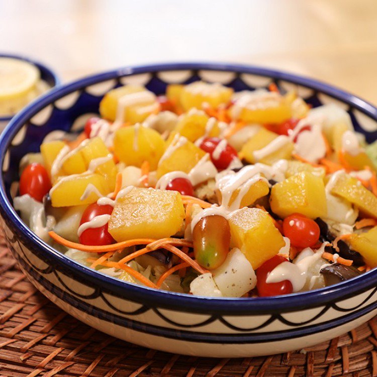3. لتحضير السلطة: ضعي الخس في قاع طبق التقديم، ثم أضيفي الباذنجان المشوي، والبطاطس المسلوقة، والجزر المبشور، والطماطم الكرزية، والقرع.