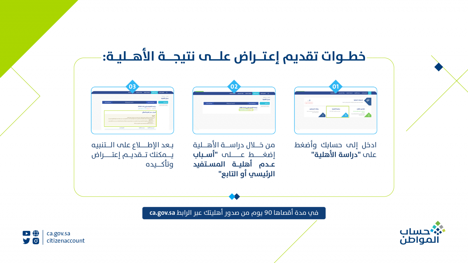 وشدد البرنامج أن الاعتراض يأتي في مدة أقصاها 90 يوم من صدور أهلية المستفيد عبر الرابط ca.gov.sa
