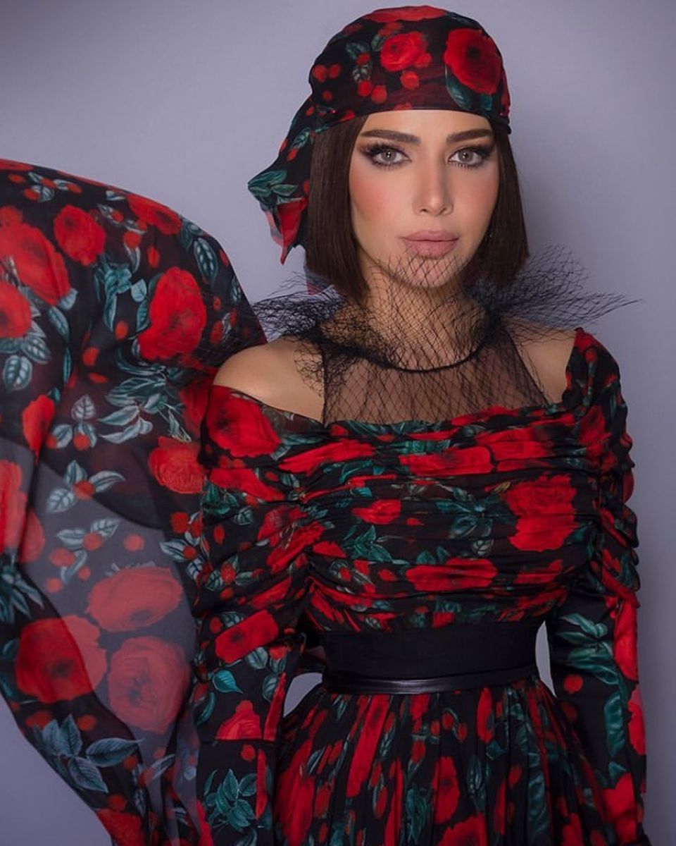 وبدت أصالة بفستان بأجواء مبهجه بصيحة الأوف شولدر، ومطبوع عليه بالورود الحمراء المبهجه، ومُزين بدانتيل مُفرغ ناحية الصدر، كما حددت خصرها بحزام أسود عريض؛ ليعطيها قوام ممشوق وجذاب.